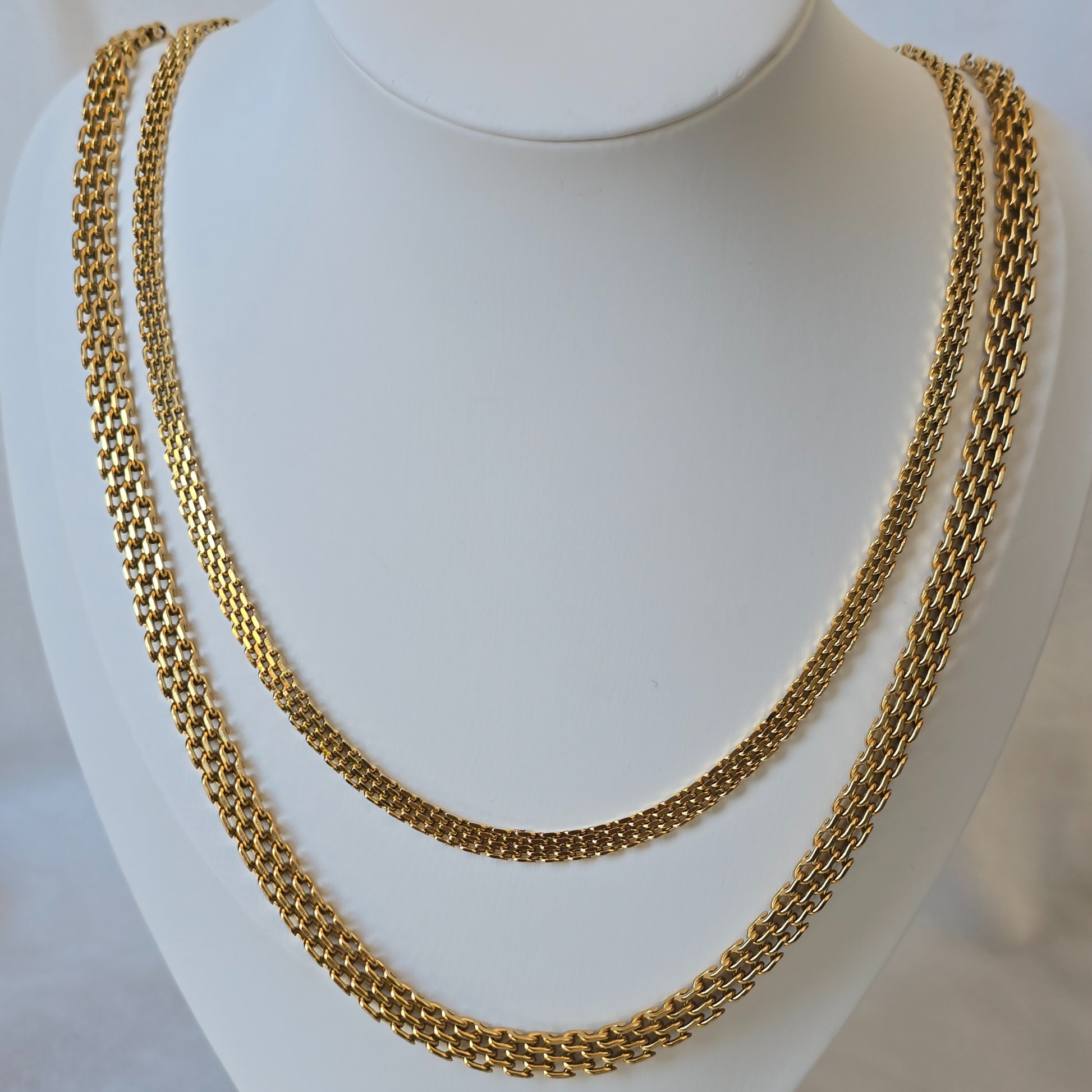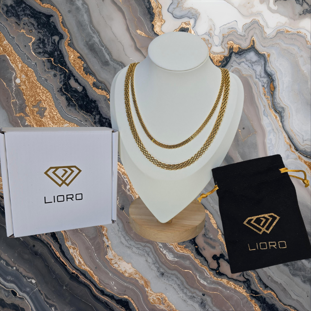 La Cadena Chinesca Hombre 65 cm / 6 mm + Cadena Chinesca Mujer 45 cm / 4 mm en Oro Laminado 18K tiene todo el brillo y presencia del oro puro, pero a un precio accesible y con garantía de por vida.